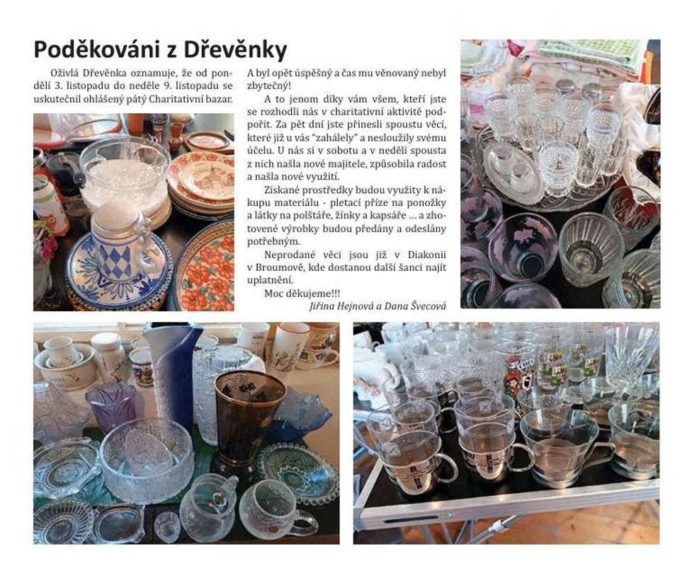 Věci - kromě šatstva a obuvi - budeme v Dřevěnce bezplatně vybírat od pondělí 10. října do pátku 14. října vždy dopoledne od 9.30 do 12.00 a odpoledne od 13.30 do 17 hodin, v sobotu 15. října proběhne od 8.30 do 15.00 hodin jejich výstava a prodej za opravdu lidové či dohodou stanovené ceny. Neprodané věci budou předány do Diakonie a výtěžek akce přispěje na další aktivity v Dřevěnce.