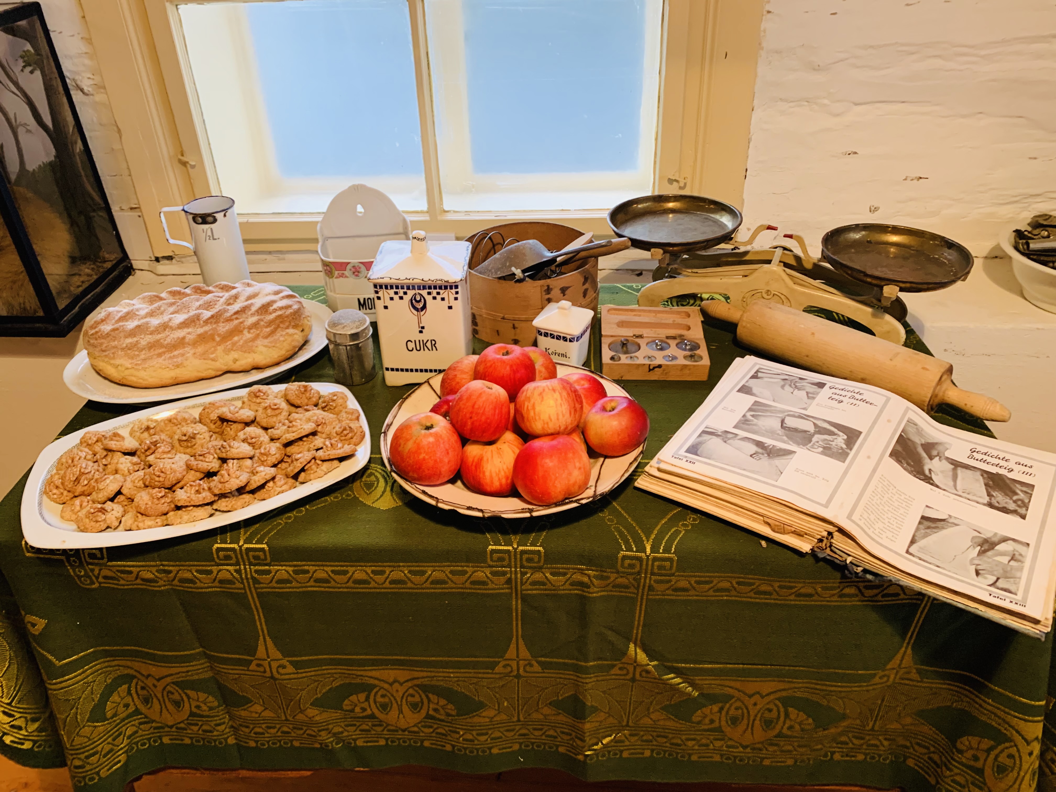 ořechový likér, chlebíčky, bábovku, zákusky a meruňkový koláč.